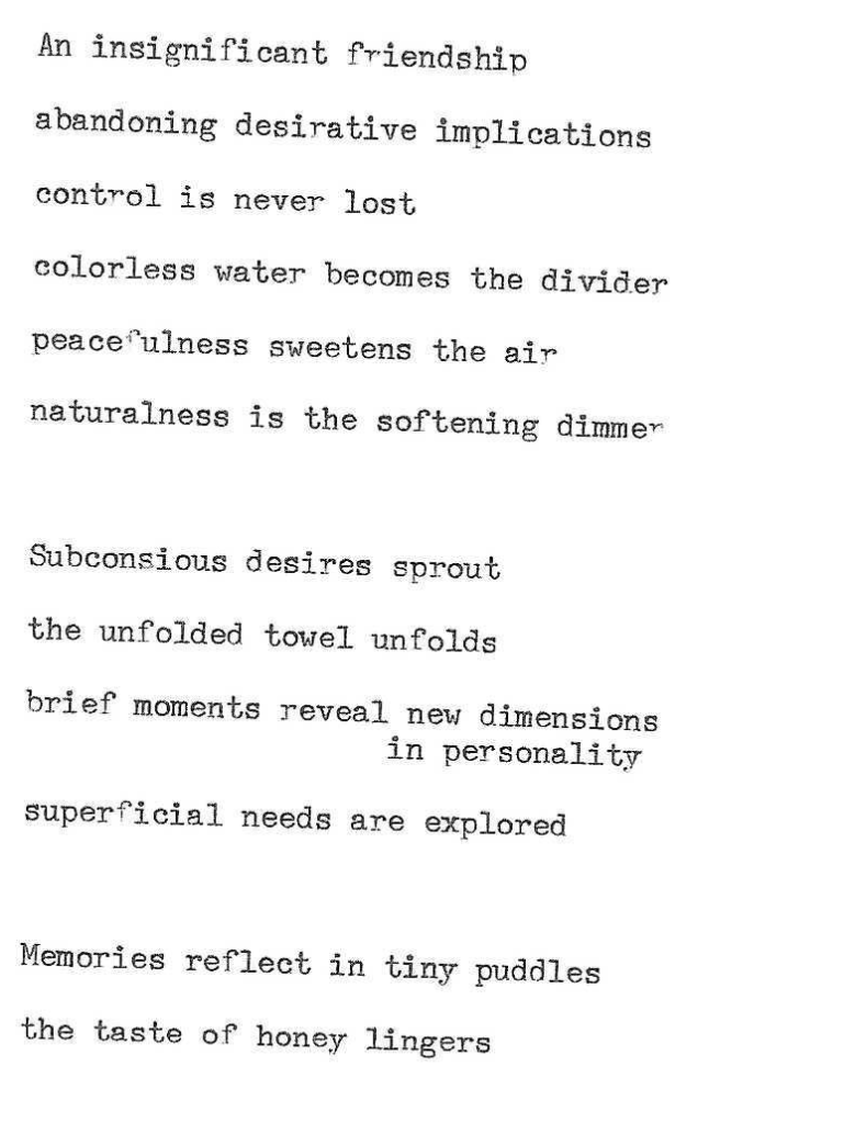 Poem March 1975 lesliegarber Uncategorized January 24, 2024 1 Minute Poems 1974 POEM 1974 Share this: Share on X (Opens in new window) X Share on Facebook (Opens in new window) Facebook Like Loading... Related Published by lesliegarber View all posts by lesliegarber Published January 24, 2024